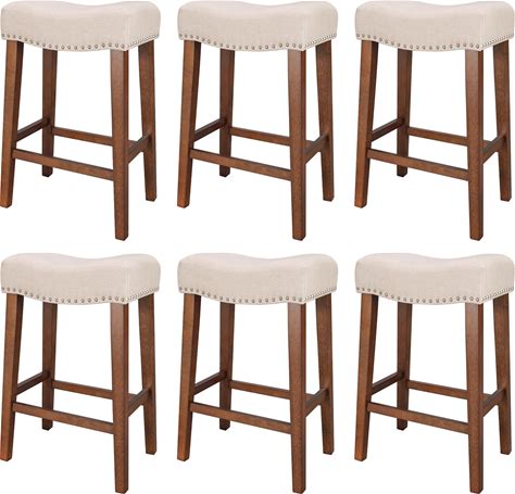 Primezone Counter Height Bar Stools Set Of 6 - Backless Saddle Barstools With 4.3" Thick Upholstered, Nailhead Trim Linen Fabric & Solid Wood Legs, 26