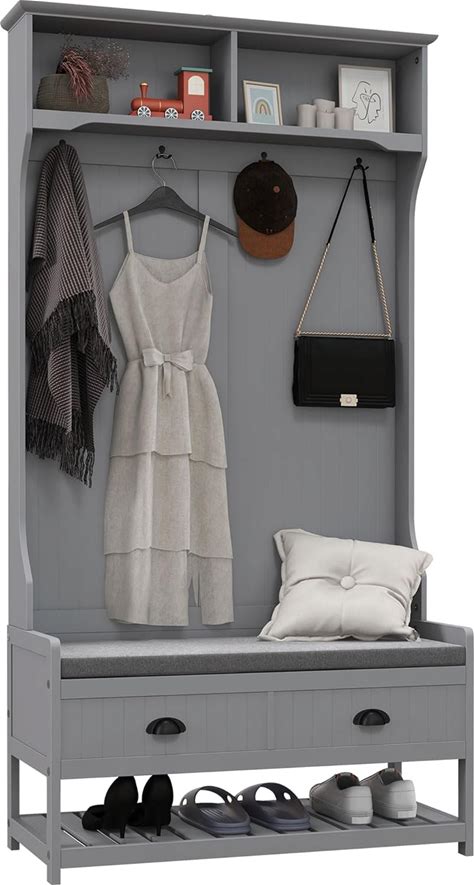 28" 3-In-1 Entryway Hall Tree With Storage Bench, Mud Room Farmhouse Garage Lockers Coat Rack With 4 Hooks And Shoe Cabinet Organizer For Mudroom, Hallway,Living Room Furniture Home,Gray(Grey)