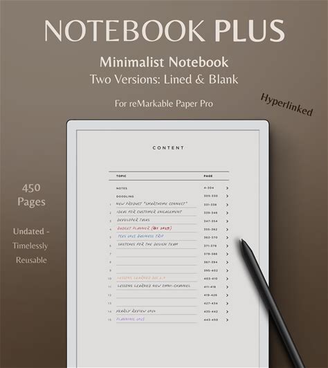 Notebook Plus - Lined & Blank Template For Remarkable Paper Pro | Minimalist | 450 Hyperlinked Pages With Section For Topics + Doodling
