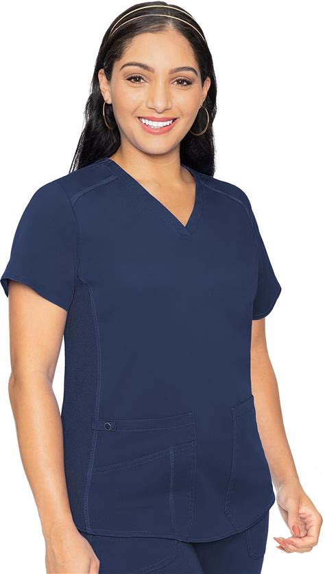 Med Couture V-Neck Scrub Top For Women With 4 Pockets, Rib-Knit Side Panel, And Shirttail Hem MC7459